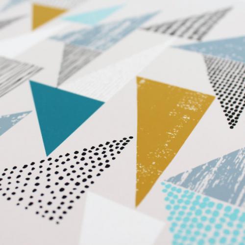 こちらはターコイズやミント、グレーの幾何学模様が、ランドスケープに配置された北欧テイストも感じさせるアートプリント。